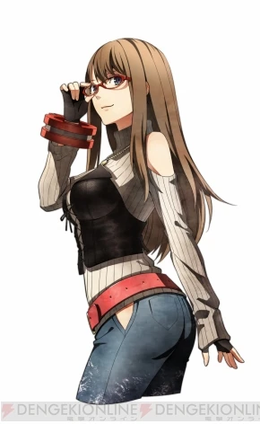 She wears a white sweater with shoulder holes, and a black strapless bustier worn over it; completing her outfit is a denim pair of pants with red belt, and a pair of black shoes.